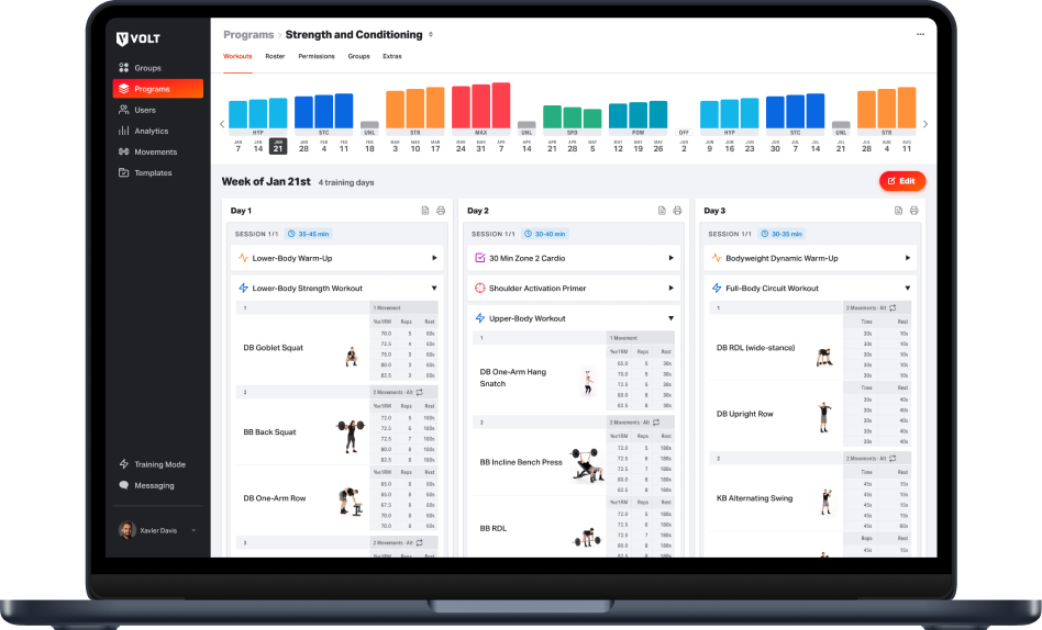 Volt saves coaches time by generating year-round training programs, offering a library of exercises, and tracking athlete performance through the Coach Dashboard.