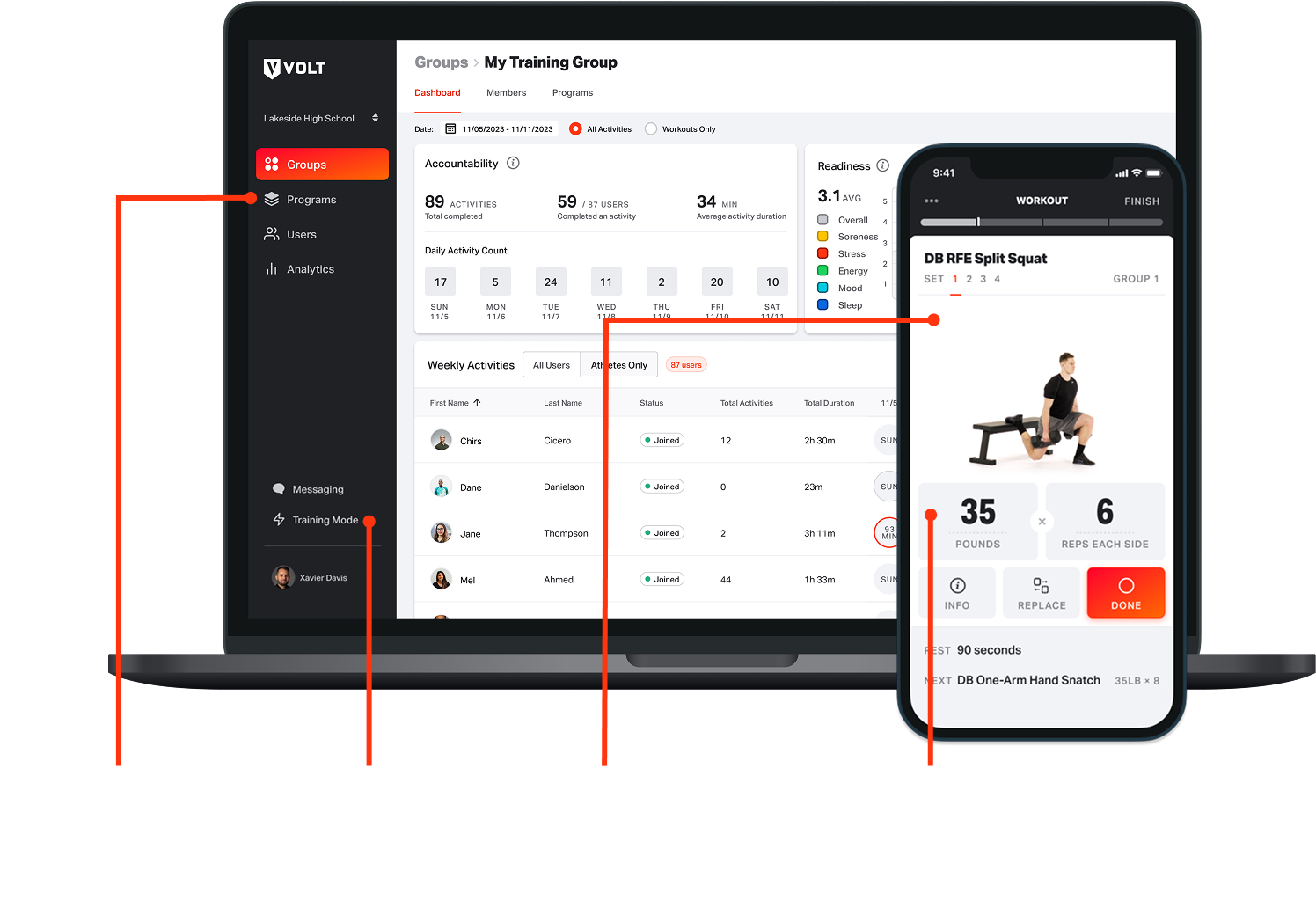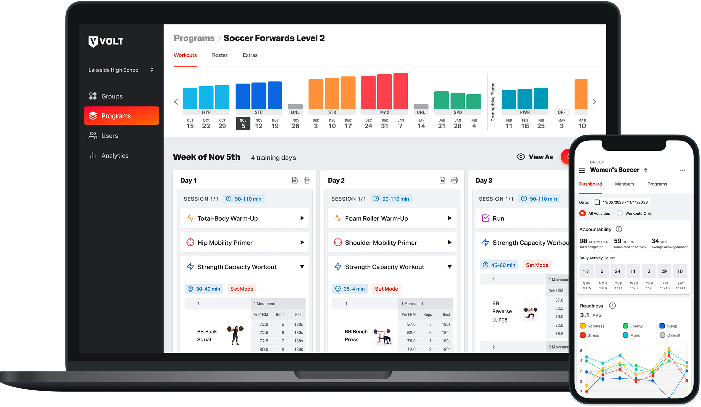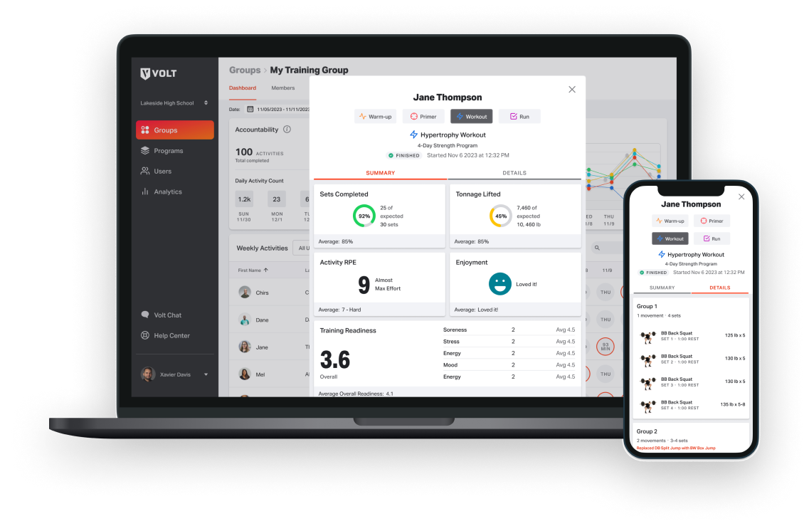 Volt’s Coach Dashboard provides real-time metrics on athlete readiness, accountability, and performance.